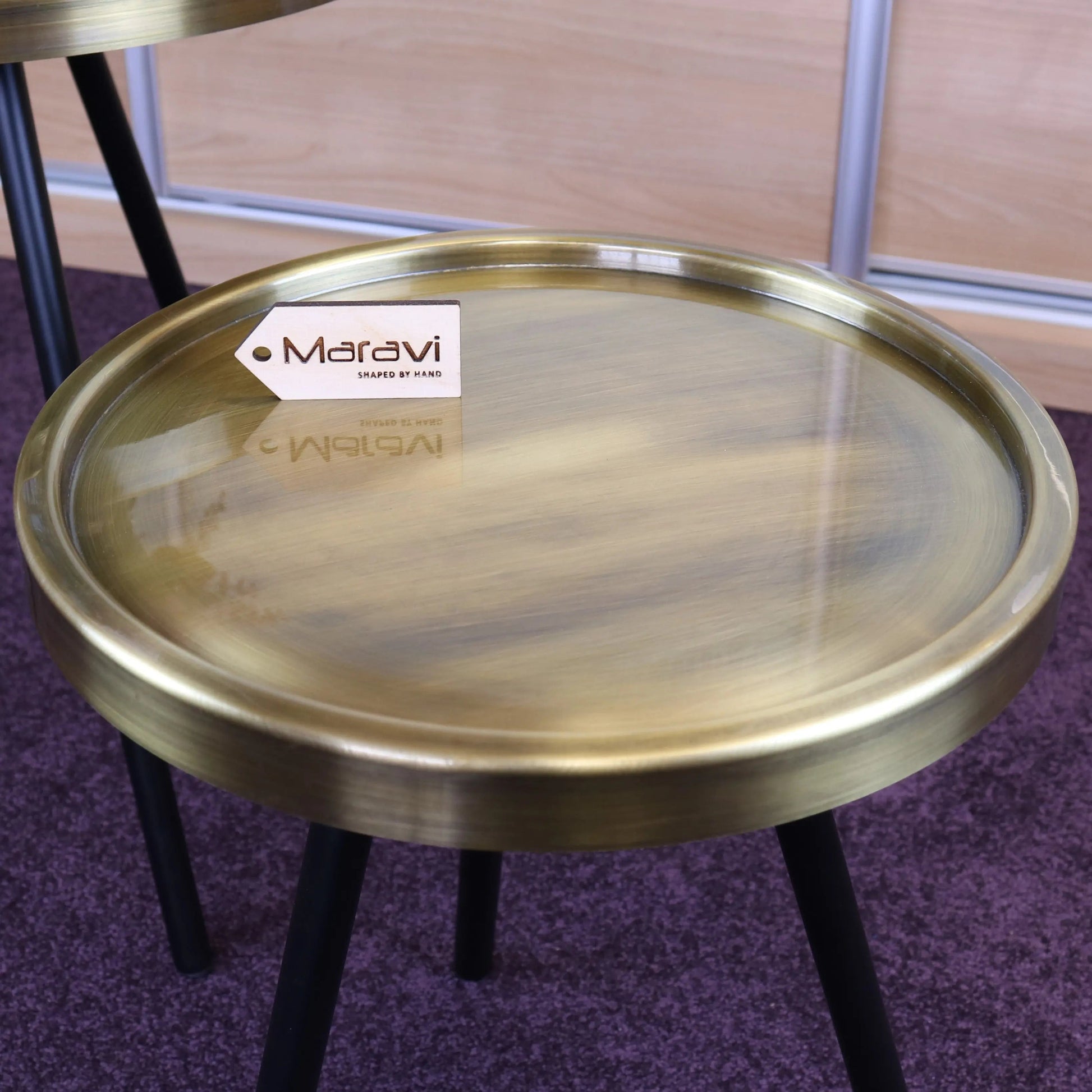 Elevate your home decor with the Ari Set of 2 Metal Round Side Tables. These tables are perfect for adding a touch of vintage chic to any room. Finished in an antiqued gold with sleek black legs, they bring a stylish and sophisticated look to your living room or bedroom.
