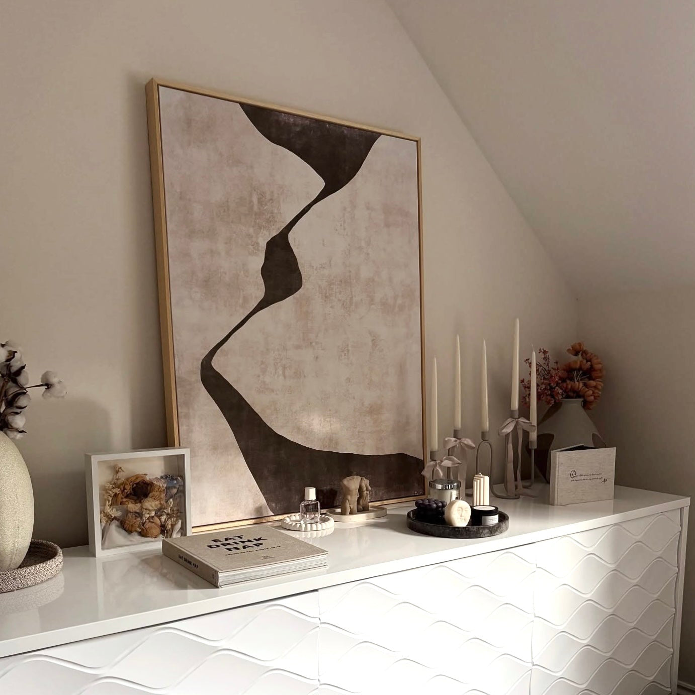Create a stylish focal point to your space with ‘Gigi ll’, composed of curvaceous flowing brown shapes, starkly contrasted against a tonal beige background. ‘Gigi ll’ can be hung alone or work well as a pair with either ‘Gigi l’ or “Gigi lll’.